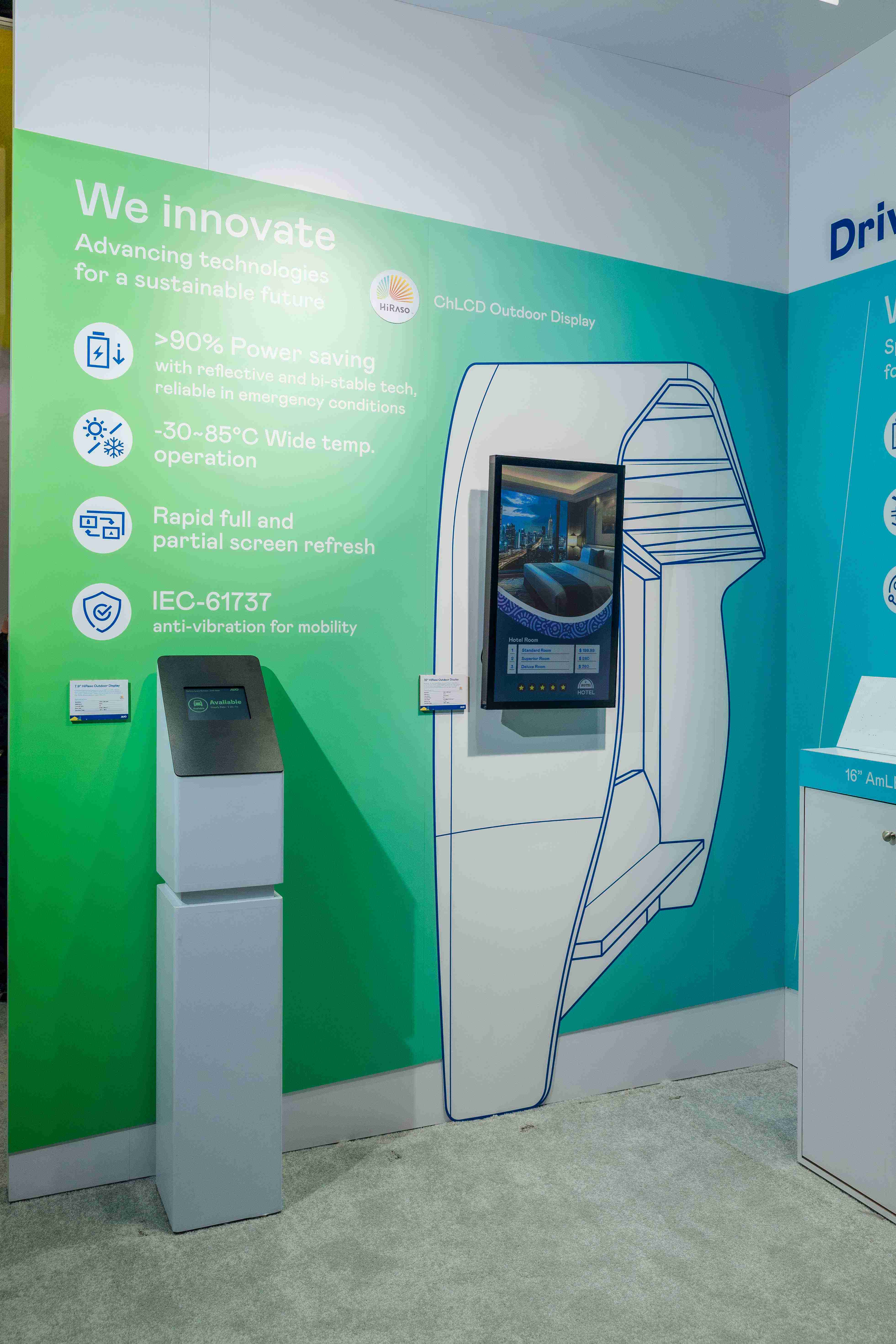 HiRaso胆固醇液晶显示器运用反射环境光线的方式,,,,呈现影像显示时零耗能的环保省电诉求,,光线愈强愈能呈现绝佳的色彩饱和度及显示效果,,同时在摄氏-30度至85度间宽温的使用优势,,,为户外电子看板的新首选。。