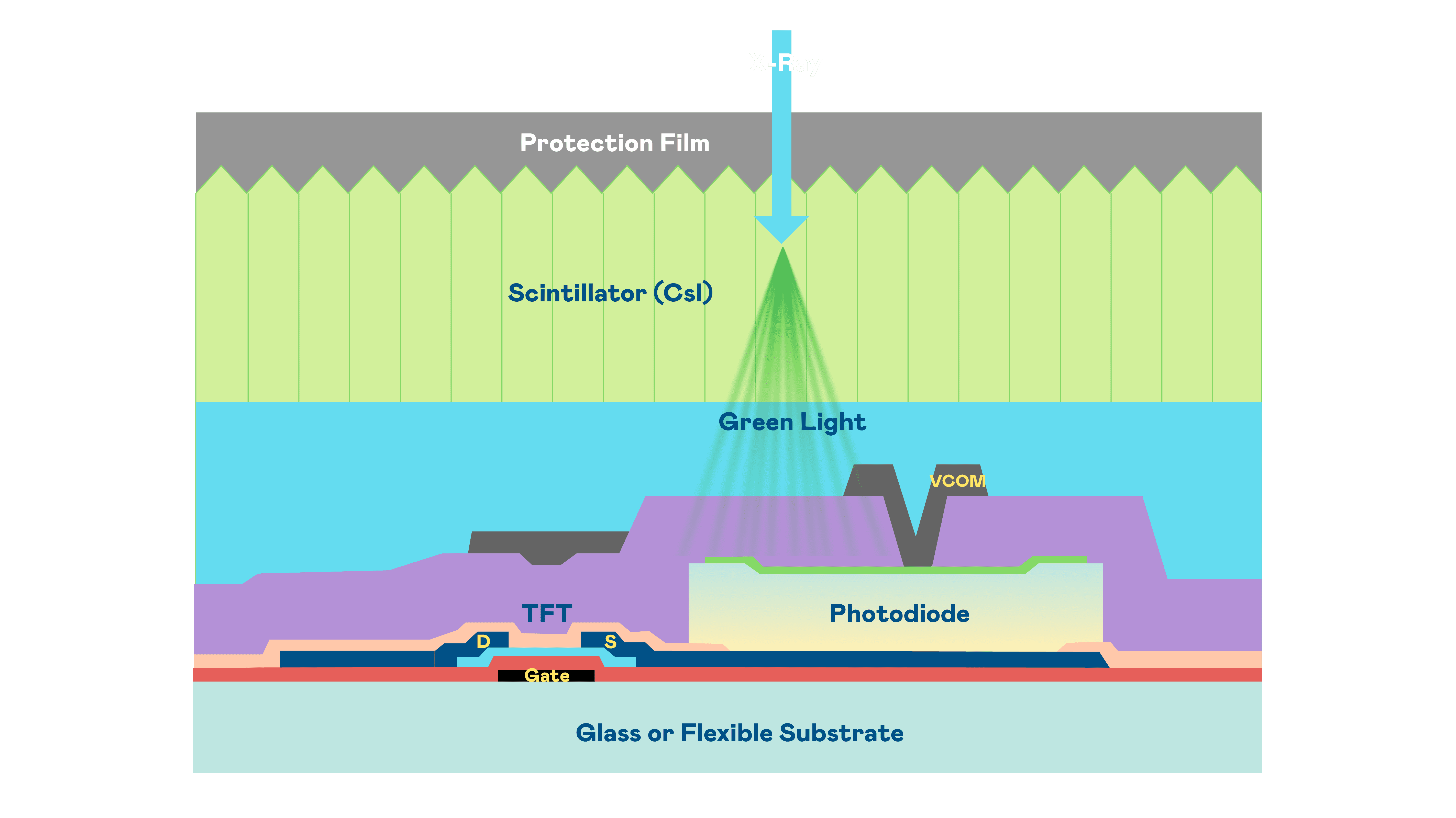 红龙扑克的X光影像感测阵列使用薄膜电晶体 (TFT) 作为每个像素的读取开关,,,搭配光电二极体(Photodiode)的光电转换元件,,,,用以感测X光影像讯号。。
